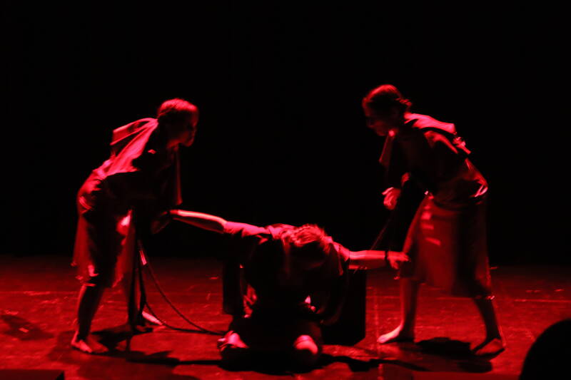 This piece was my first year final performance for my MFA, and I wanted to experiment with adaptations, movement, and ensemble theatre. The most experimental part of the project was the string that connected the three performers at the wrist for the duration of the piece. I wanted to literalize the connection the three women had as well as the restrictive nature of their lives through the string. It was an interesting challenge the actors and I had to overcome in rehearsals. The string proved to be incredibly finicky, so the movements of the actors had to be both precise and consistent in order for the string to work. It was a difficult, yet rewarding experience as we witnessed the string become a character in its own right through our work in the rehearsal room. I learned a lot from The Women of the House of Atreus that I plan to put into action with the expanded version, They Weave with String that Suffocates.