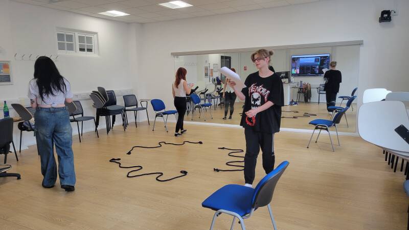 After Housekeeping and Check-Ins, I always do a warm up of sorts. For this show, I implemented trust falls as part of the warm up process. In the show, the performers are literally tied to each other and thus rely on each other, so it's important that they trust one another. I found that the trust falls helped strengthen that trust, and also made rehearsal fun, as the performers really seemed to enjoy doing the trust fall. It also helps that the performers went through their BA together, so there's already a lot of natural trust there. Beyond trust falls, I would often run my actors through tongue twisters to prepare their mouths for the complex lines in the play. I would also run them through energy exercises to get their bodies warm and ready to work with the ever-tricky string.